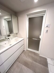 洗面化粧台は身だしなみを整えるのに便利な三面鏡付き。