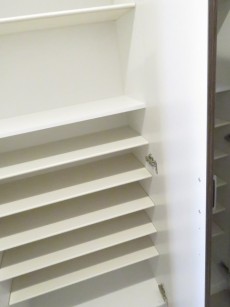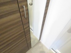 玄関横にはたっぷり仕舞えるトールサイズのシューズBOXが設置されています。可動棚なので棚の高さは調節可能。表扉の一部には縦長の鏡がついており、お出かけ前の身だしなみチェックもサッと済ませられて便利です。