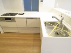 キッチンはリビングにいる家族と会話を楽しみながらお料理ができる対面式。L字型なので調理スペースが広く、作業もしやすそうです。水栓は浄水機能付き、コンロは3口ガスコンロ、食洗機にグリル付きとスペック◎!窓もあるのでお料理中のにおいや熱も解消しやすいかと思います。