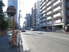 エントランス前の通り。周辺はマンションやビルが建ち並んでいます。