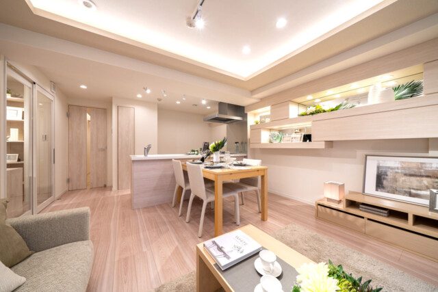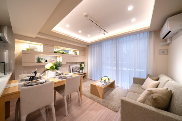 南東向きのバルコニーに面したお部屋です。キッチン、ダイニング、リビングと並んだオーソドックスなレイアウトですが、幅があるのでひとつひとつがゆったりとした印象です。折り上げ天井のおかげでソファーに座ってみるととても解放感がありましたよ。