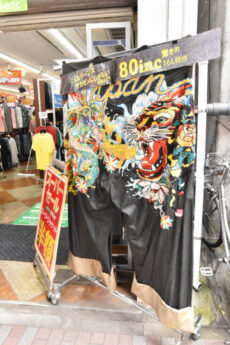 ビッグサイズ専門店サカゼンの本店もこちらにあります。店頭に飾られていた80インチのデニム!!!まるで着物のようですね(笑)
