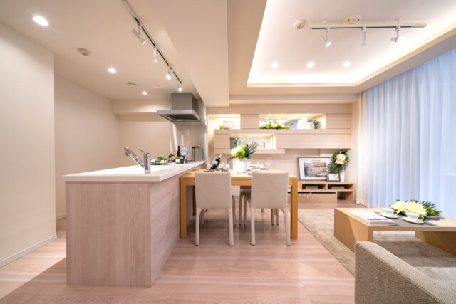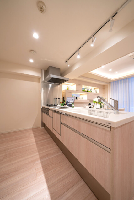 キッチンは人気のカウンタータイプ。お料理中でもコミュニケーションがとりやすいのが人気の理由です。友人を招いた時などでも、おつまみを作りながらワイワイ出来るのがいいですよね。「浄水機能一体型水栓」や「食器洗浄乾燥機」など装備も充実!