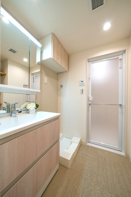 洗面台の他に洗濯機スペースと浴室が付いていて、脱衣所も兼ねています。洗濯機スペースには吊戸棚が付いていますので、洗剤などはこちらへどうぞ。洗面台は三面鏡付で身だしなみのチェックも楽々。洗面台自体に照明が付いているので影になることもありませんよ。床の足ざわりの良さは是非一度体験して欲しいところです。