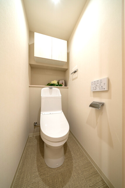 ゆったりしたサイズで、トイレットペーパーなどのストックに便利な吊戸棚も付いています。もちろん洗浄便座付き。TOTO製のウォシュレットです。