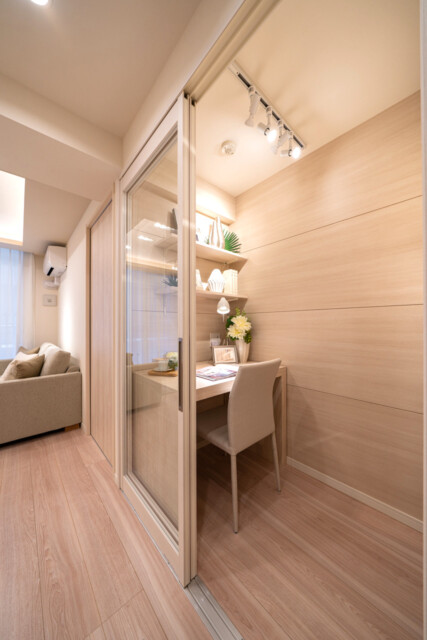キッチンの隣にはDEN。ガラス張りなのでまるでLDKの一部のようです。コンパクトなので扉は開けておいた方が解放感があっていいかもしれませんね。デスクが造り付けになっていて、ホビールームとしてやテレワーク時など何かと便利なお部屋です。