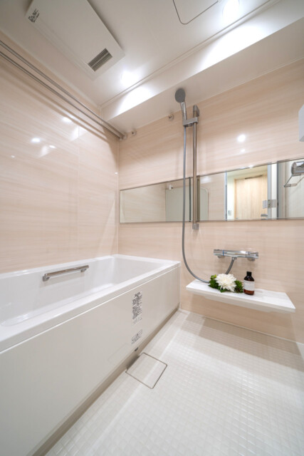 浴室はベージュの木目パネルで優しい雰囲気。追い焚き機能付きユニットバスなので、いつでも適温のお風呂に入れますよ。スイッチひとつでお風呂を張れるのも嬉しいですね。浴室乾燥機付きで雨の日のお洗濯も安心です。