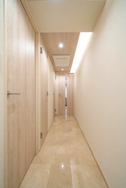玄関から廊下にかけては大理石が貼られて高級感たっぷり。白木の風合いの建具ともよくマッチしています。天井がクロスじゃないのもいいですね。
