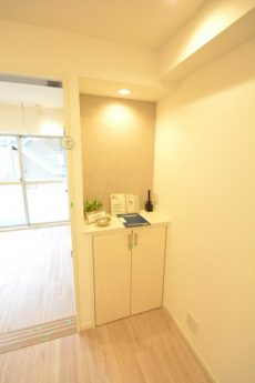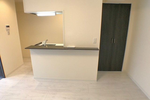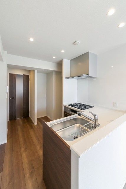 キッチンはお部屋の雰囲気に合わせた木目パネルを使用。
