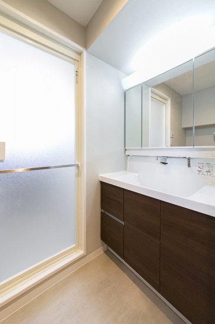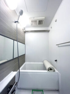 1216サイズの浴室はお部屋と統一感を持たせた木目パネルを使用。広く見せる効果のあるワイドミラーも付けられています。温かみのある雰囲気で心地よいバスタイムを過ごせそうですね。雨の日のお洗濯物乾燥に便利な浴室換気乾燥機付き!