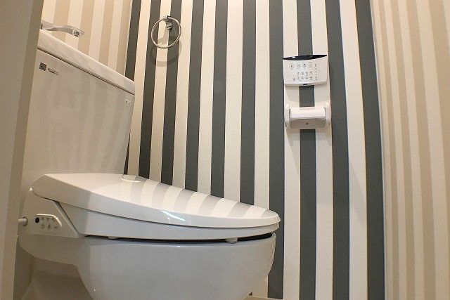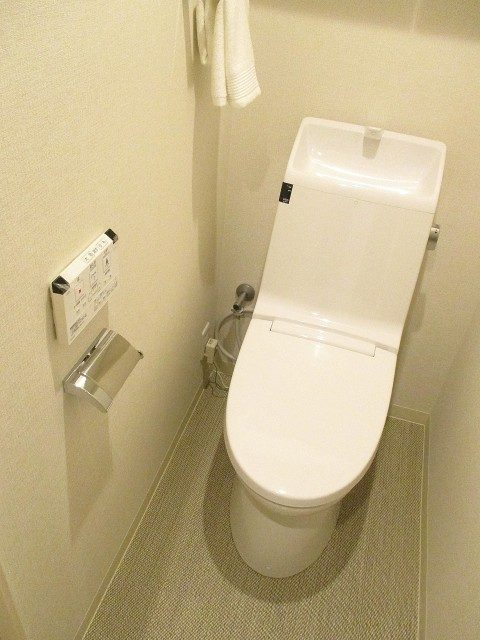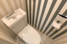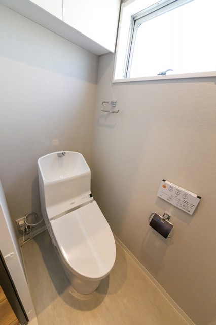 トイレはTOTO製の洗浄機能一体型。トイレットペーパーのストックや掃除道具などの収納に便利な吊戸棚も付いています。