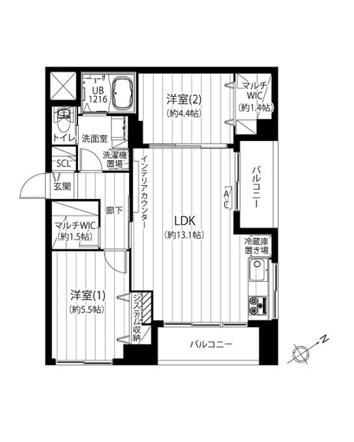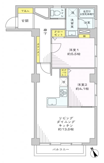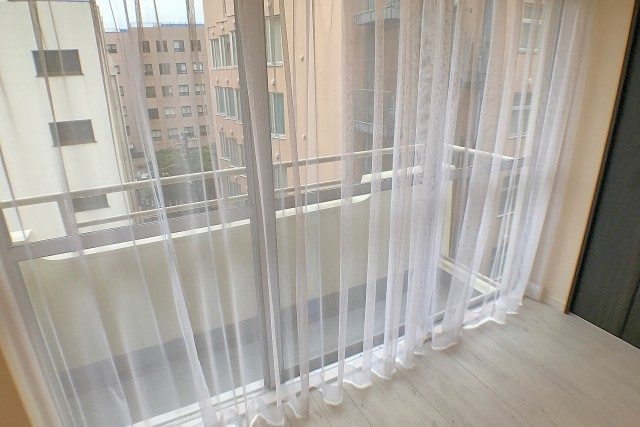 南東・北東二つのバルコニーに面したお部屋です。方角的に日当たりはあまり期待出来ませんが風通しは良さそうですね。壁付けキッチンにすることによって数字以上に広々とした印象です。家具付きなのでこのままのイメージで生活を始めることが出来ますよ。