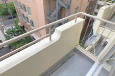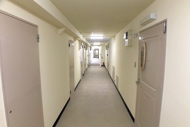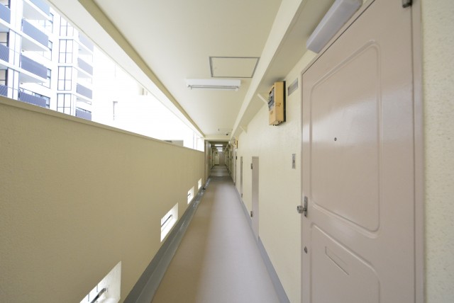 外廊下を進みます。手摺壁はかなり高め。プライバシーの為かと思われます。その代わりか、足元には光や風を通す小窓が付いていました。