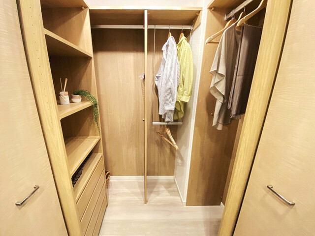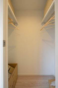 約1.5帖のマルチタイプの収納です。廊下にウォークインクローゼットってちょっとびっくりですね!衣類だけでなく、シーズンオフの季節家電やスーツケースなどを置いておく物入としても使えそうです。