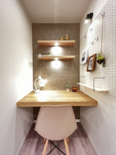 洗濯機スペースの隣にはデスクが造り付けになっています。棚や有孔ボードなども付けられ、ちょっとした書斎のようですね。実際座ってみると目に入るのは壁ばかり。これは集中できること請け合いです!