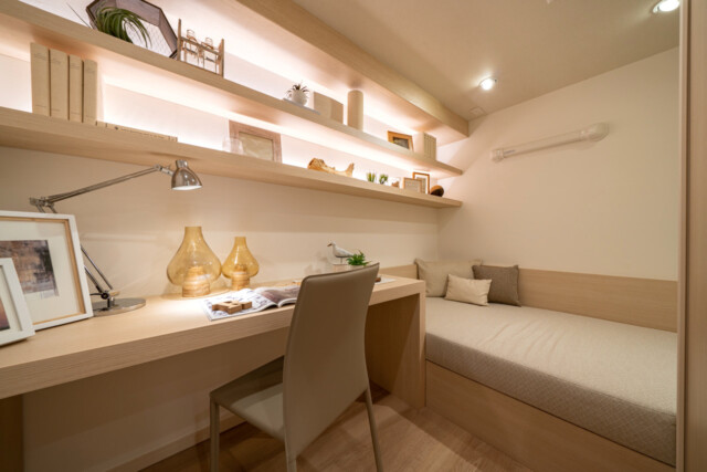 デスクや棚、ソファーベッドまで造り付けになっています。ホビールームとして、書斎として、使い道を考えるのが楽しみなお部屋ですね。在宅勤務にもぴったりかとは思いますが、ソファーベッドの誘惑をどう断ち切るかが問題です(笑)部屋への入口がキッチン奥の扉とシステム収納の奥の扉という、隠し部屋的なところもポイント。小さいお子様なら「ここ僕の部屋!」とか言いそうですね(^^)