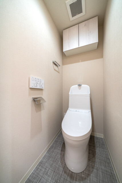 トイレはTOTO製の温水洗浄機能一体型。いろいろ飾ってインテリアを楽しめるニッチカウンターや、トイレットペーパーストックなどの収納に便利な吊り戸棚も付いています。