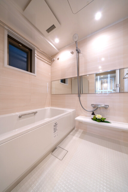 浴室はベージュの木目パネルを使用。柔らかな雰囲気に癒されて一日の疲れもすっかり洗い流せそうですね♬ 追い焚き機能や浴室換気乾燥機などの便利機能も充実していて、天気を気にすることなくお洗濯が出来ますよ。