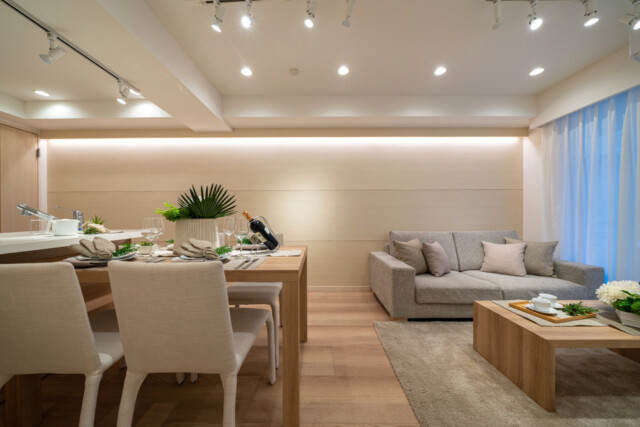 キッチン、ダイニング、リビングと並んだ縦長のお部屋。オーソドックスなレイアウトですが、これが使いやすいんですよね。家具は見本なので付いてはきませんが、大きさや色の参考になって助かります。