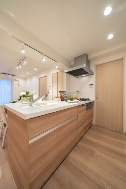 キッチンはカウンタータイプ。開放的で、お料理中でもリビングダイニングとコミュニケーションをとりやすいのが特徴です。お友達を招いての家呑みも、つまみを作りながらワイワイ盛り上がれますよ! 食器洗浄乾燥機や浄水器一体型水栓などの便利機能ももれなく付いています。