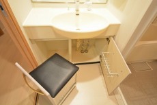 左側のドアはサニタリールームです。洗面台下の引き出しを引くと、何と!引出しではなくスツールでした(^v^)奥様のお化粧時にはこういう遊び心が有り難いですよね~(*^。^*)