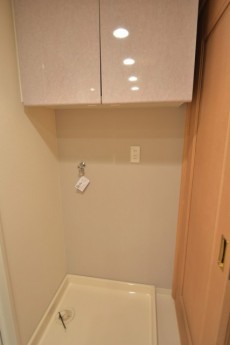 洗面台の正面は洗濯機置場になっています。上部には大きな棚が付いているので、洗剤やハンガー等々、いろいろスッキリしまっておけそうです♪