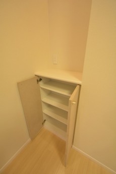 左側のシューズボックスは棚の数も多く、靴を入れるスペースは棚が斜めになっているので、収納した靴がお店のように並びます♪一番下の引き出しは踏み台にもなるので、高い所の荷物を取り出す時に重宝しそうです(^v^)