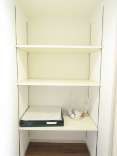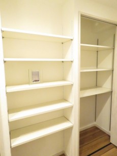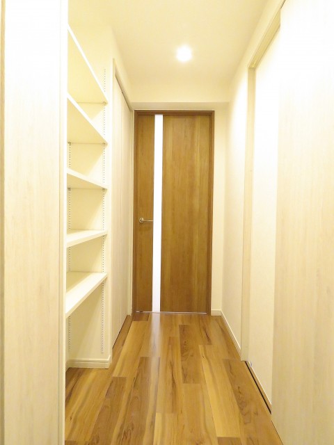 廊下の左側には扉付きの洗濯機置場と棚付の収納スペースがつくられています。