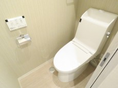 トイレはウォシュレット付き。上に吊戸棚と収納スペースも確保されています。