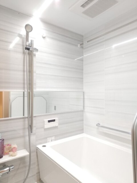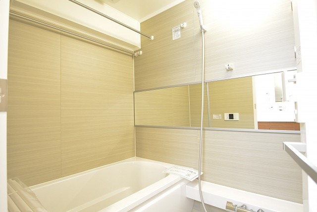 浴室は木目パネルに囲まれた落ち着いた雰囲気。ゆったりと湯舟に浸かれば一日の疲れも洗い流せそうですね♬ 追い焚き機能付きの給湯器はボタンひとつでお風呂の準備や保温をしてくれるので、いつでも温かいお風呂に入ることができますよ。花粉や雨が多い季節に嬉しい浴室換気乾燥機能付き!