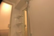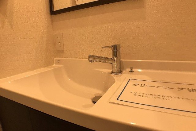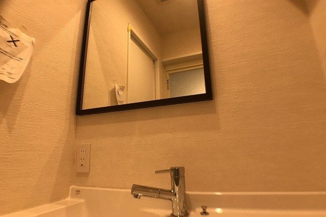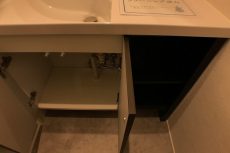 ミラーまわりに収納は特に設けられていませんが、サイドにフリースペースが設けてあるので、小物などの収納にはラックなどを置いて工夫したいところです。