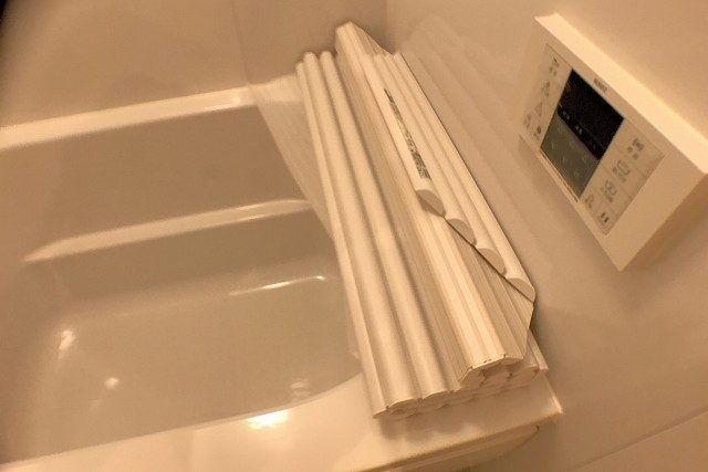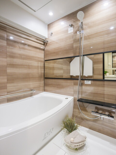 ナチュラルな色合いの木目柄の壁パネルが使われたバスルームは、追い焚き機能と