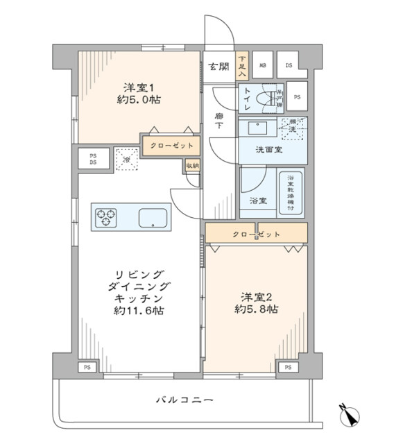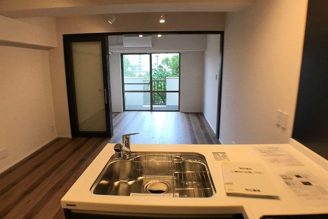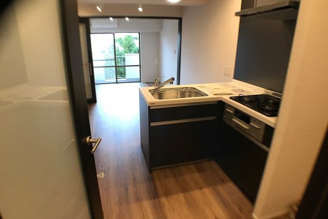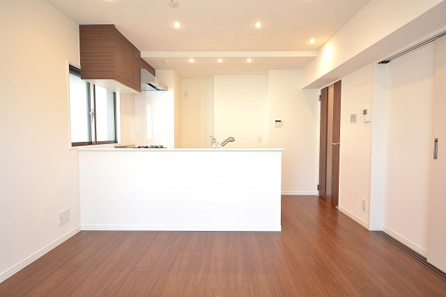こちらは約11.6帖のリビング・ダイニング・キッチン。南西向きのバルコニーに面したお部屋です。キッチン横にも北西向きの窓があり風通しも良さそうですね。バルコニーに向かってキッチン、ダイニング、リビングと並べるオーソドックスなタイプなので家具のレイアウトに悩むことはなさそうです。