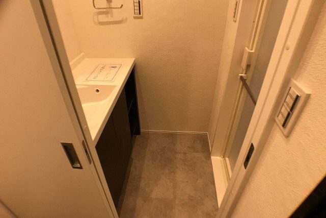 カメラの都合で赤っぽくなっていますが、モノトーンでシックにまとめられた洗面室になっています。