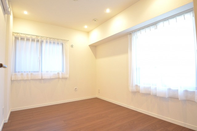 廊下へ戻って・・・こちらは約5帖の洋室。廊下に面した独立性の高いお部屋です。二面の窓からは柔らかな光が入ってきていて、北東・北西向きですが意外と明るいですね。クローゼットも付いています。