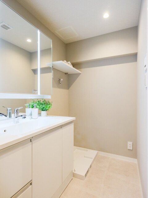 【洗面室:三面鏡付き洗面化粧台・洗濯機スペース】