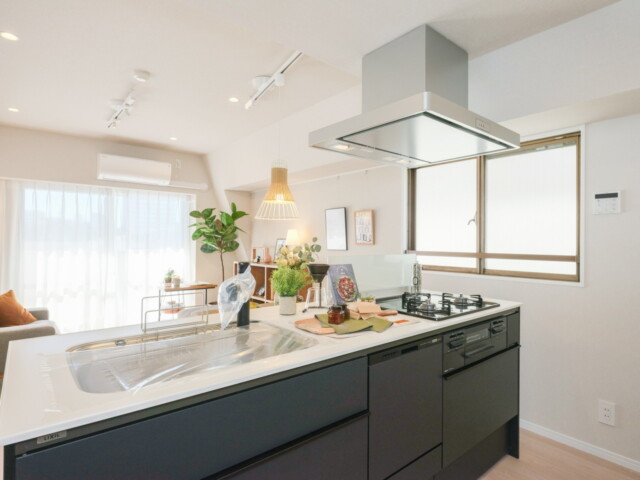 キッチンはリビングダイニングとの一体感が抜群のアイランドタイプ。ソリッドブラックのパネルを使用しシャープでスタイリッシュな印象です。この存在感はこの部屋の主役と言っても過言ではありません。食器洗浄乾燥機や浄水機能一体型水栓などの便利機能も充実していて使いやすさも満点ですよ。