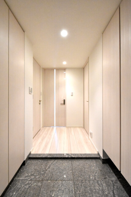 ゆったりとした幅の玄関廊下。さらに、玄関床を黒のストーンパネル、それ以外を明るいトーンで揃えることによって玄関から廊下への広がりを感じられるようにデザインされています。