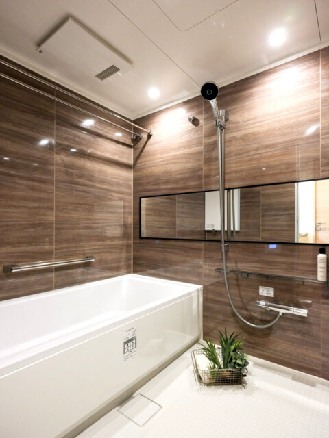 浴室は、ダークブラウンのパネルで高級感のある光沢仕上げになっています。追い焚き機能付きなので、入浴時間が家族で違う場合も温かい湯舟に入ることができ快適です。浴室には換気乾燥機もあり、雨天時のお洗濯も安心です。