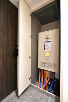 シューズボックスは収納力のあるトールタイプ。棚の高さを変えられるのでブーツやヒールなどの高さのある靴でもきれいに収めることが出来ますよ。傘入れ付きですが、中の靴のためにもよく乾かしてから入れるようにしましょう。反対側の扉は・・・電気温水器が鎮座していました。
