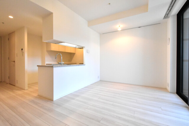 約13.2帖のリビングダイニングは、窓面積が大きいので入った瞬間に都会的で贅沢な印象を与えます。奥行きの長いレイアウトですが、幅があるのでゆったりとしています。