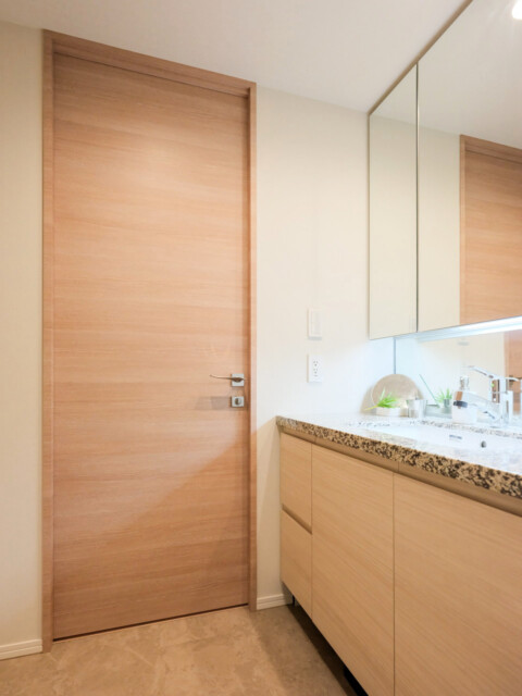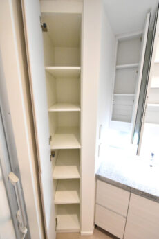 洗面化粧台は身だしなみを整えるのに便利な三面鏡付き。裏がキャビネットになっているので、洗面周りに散らかりがちな細々したものもスッキリと片付けることが出来ますよ。洗面台隣のリネン庫は奥行きが深いのでカゴなどの収納グッズを上手く使って効率的に使いましょう。