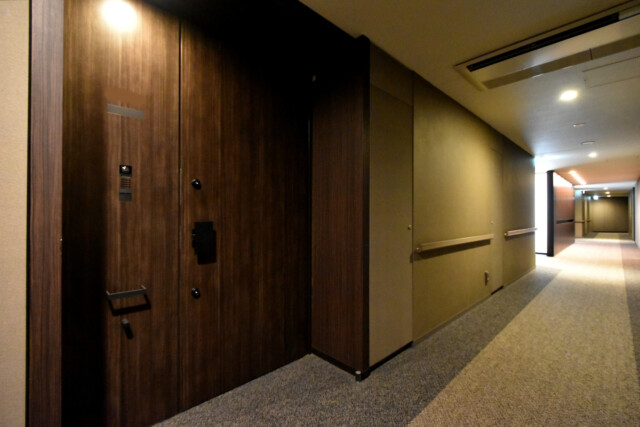 共用廊下はホテルライクな内廊下。暗く静かで快適に空調が効いた、ちょっと眠気を誘う空間です。実はこのマンション上から見るとベンツのエンブレムのような形をしているので、廊下も一直線ではなく複雑に折れ曲がっているんですよ。どこも同じ光景で住んでいても迷子になりそうです(笑)