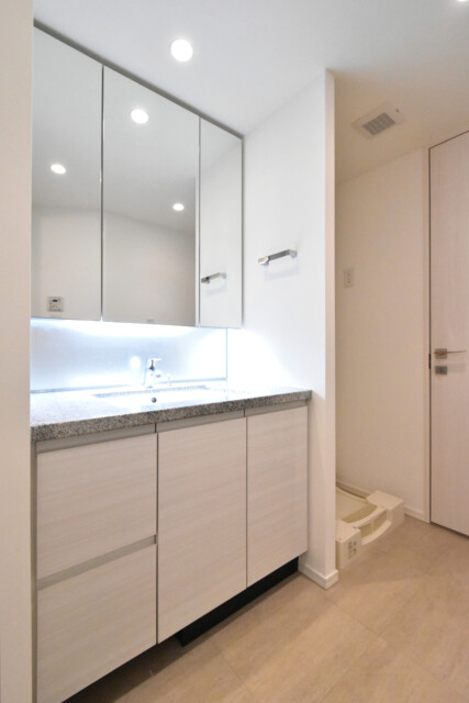 【洗面室:三面鏡付き洗面化粧台・洗濯機スペース】