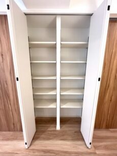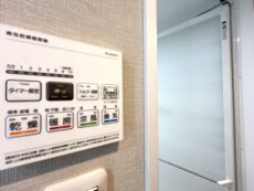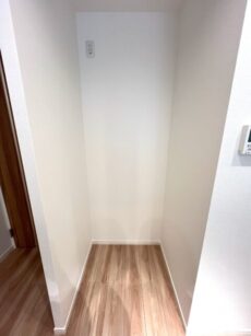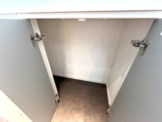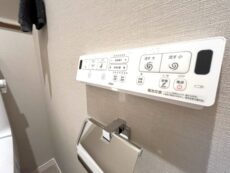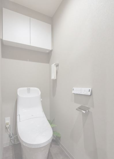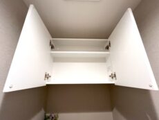 リノベ物件ですのでもちろん温水洗浄機能付き。トイレットペーパーや掃除道具などの収納に便利な吊り戸棚も付いています。