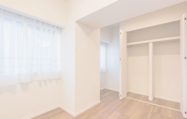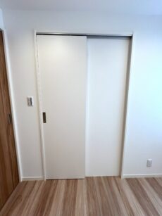 右側のドアは約5.4帖の洋室。南東向きの窓が二つも付いたお部屋です。収納は間口が広くて使い易そうなクローゼット。このタイプは中がひと目で確認出来ていいですよね。
