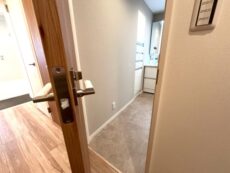 戸口から右方向に伸びた廊下です。白のクロスに濃いめの建具がアクセントになっていますね。戸口からでは奥が見えづらいのも高ポイント!