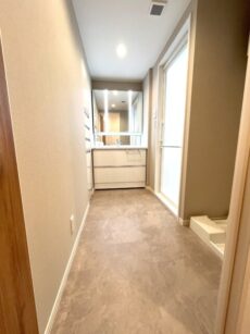 次はキッチン横の引き戸を開けて洗面室へ。こちらには洗面台、洗濯機スペース、浴室があります。ゆったりとした洗面台の上部にはライトが付いていて、鏡に映る顔を明るく照らしてくれますよ。洗濯機スペースは吊戸棚付き。洗濯グッズをすぐ手が届く所にまとめておけるのは嬉しいですね。