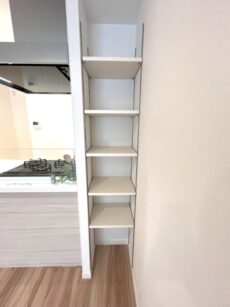 扉の付いた収納とオープンタイプの収納棚がひとつづつ。見せる見せないを意識して収納したいところです。