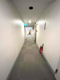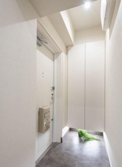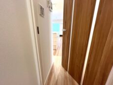 エレベーターを降りてお部屋までは内廊下。外から見えないのでプライバシー性が高く、風雨が強くても濡れたりする心配もありません。モニター付きインターホン有。